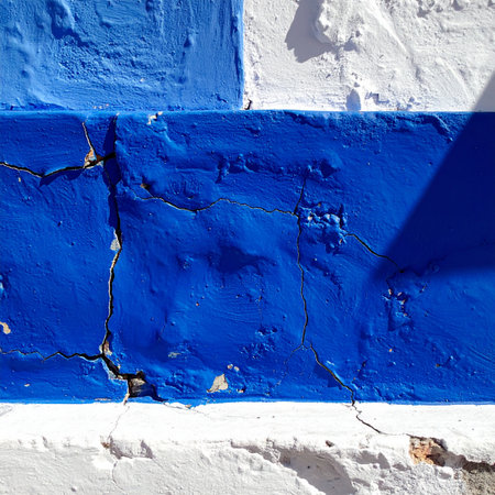 A close-up detail of a weathered wall where a bold, textured blue stripe contrasts sharply with the rough white plaster.