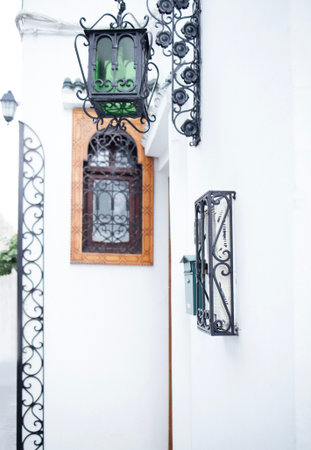 Charming street view with a vintage lantern and intricate wrought ironwork on a white wall, highlighting architectural elegance and inviting atmosphere