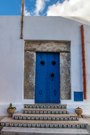 The Blue Arabesque Door of an Ancient Arabesque-Style House. Tunisia