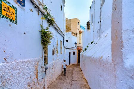 Asilah, Morocco - 19 September 2019: A narrow street in with blue & white & red style.