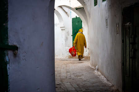 In the medina of Chefchaouen in Morocco. A man wearing the traditional Berber coat walks down the narrow street carrying a red bag