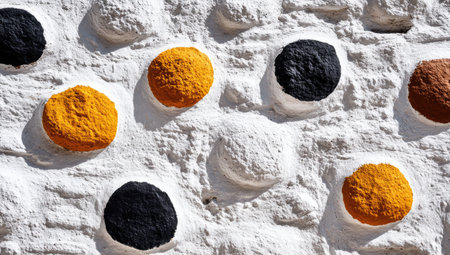 Close-up view of a textured white wall featuring circular painted designs in black, orange, and tan colors. The circles are applied to the surface of the wall, which has a slightly rough texture. The color contrasts create a decorative pattern.
