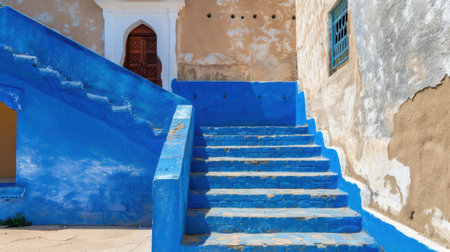 A stunning image of a vibrant blue staircase leading to an ornate door, showcasing the unique texture of the historical wall and captivating architecture.