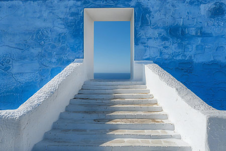 White stairs and blue wall with blue sky in Oia, Santorini, Greece
