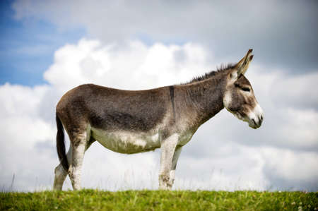 Donkey Looking at Camera with Blue Sky and Clouds in the Background. High quality photo