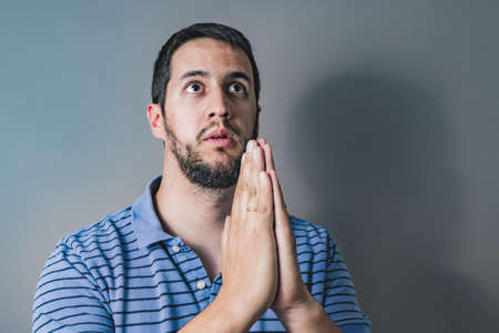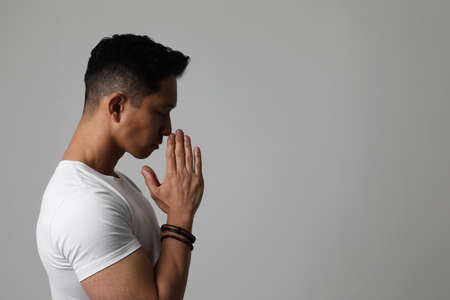 man praying to god with hands together on grey background stock photo
