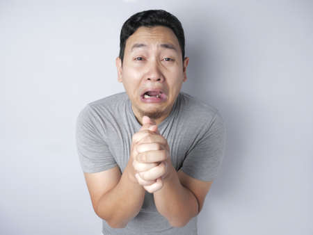 Funny face of Asian man begs for forgiveness of his mistake.