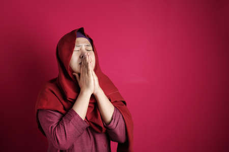 Portrait of sad Asian muslim woman crying against red background
