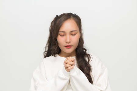 Beautiful Asian woman wearing white sweater praying on white background.