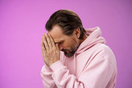 Concerned upset man supplicating asking god mercy help praying bow head close eyes hold hands pray hopefully waiting miracle worried wife health, standing sadness purple background