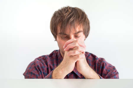 White Caucasian male in burgundy red shirt praying with his hand together closed eyes isolated against white background 2020