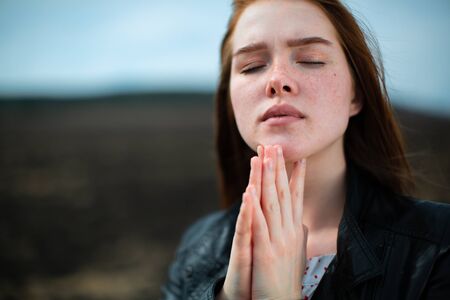 Red-haired girl prays with closed eyes