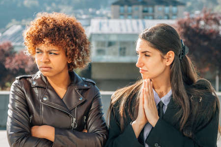 Hispanic man apologizing disappointed young woman with hands clasped
