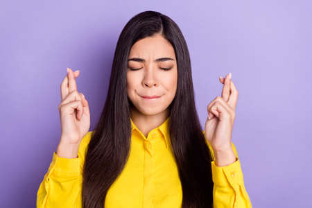 Photo of brown hairdo sad young lady crossed fingers closed eyes wear yellow shirt isolated on purple background