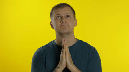 Body language nonverbal communication. Hope. Young man looking upset begging for mercy sympathy praying gesture.