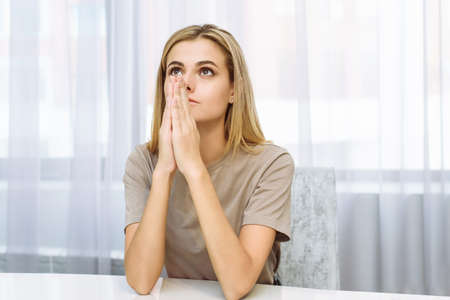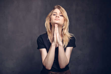 Cute beautiful young woman folded her hands in prayer. A woman asks God for help.