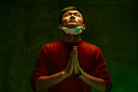 Asian man with protective nask looking up and praying to God