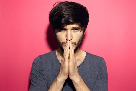 Portrait of young man praying on background of coral pink.