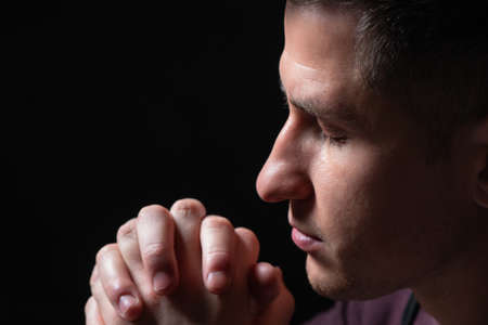 Man prays to god on black studio background
