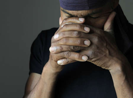 Man cover his face with his hands and thinks about life. Handsome man pray and believe in God. Orthodox Christian faith.