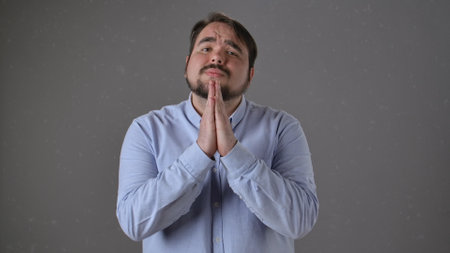 Portrait of man showing clasped hands, asking for help or excuse. Please, forgive me the concept