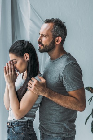 side view of bearded man embracing and supporting sad young woman with hands on face
