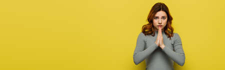 upset woman showing please gesture and looking at camera on yellow, banner