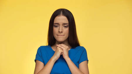 pensive young brunette woman in blue t-shirt standing with clenched hands isolated on yellow