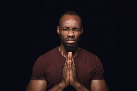 Close up portrait of young man isolated on black studio background. Photoshot of real emotions of male model. Praying looking forward, sad and hopeful. Facial expression, human emotions concept.