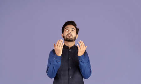 Religious Indian guy praying to God, asking for redemption on violet background, panorama