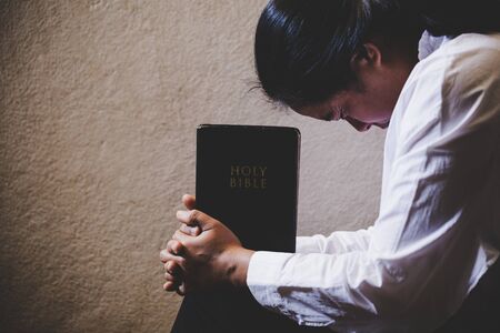 Hands folded in prayer on a Holy Bible in church concept for faith, spirituality and religion, woman praying on holy bible in the morning. woman hand with Bible praying.