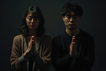 Japanese man and woman pray to god together on dark studio background. Cinematic effect