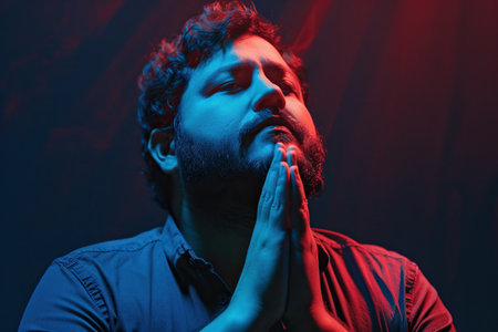 Latin American man prays to god on dark studio background. Cinematic effect