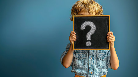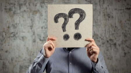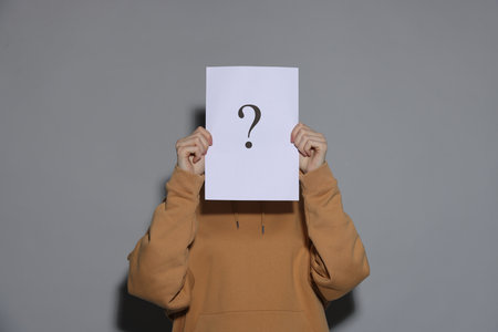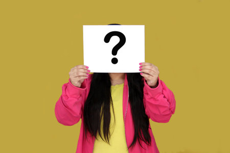 An anonymous woman holds a cardboard sign featuring a question mark, symbolizing curiosity and mystery.