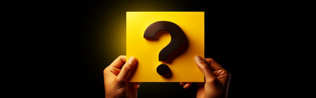 Extreme close-up of two male hands, holding a black question mark on yellow-orange paper, against a black background with copy space. Q and A concept, blank wide banner. Generative Ai.