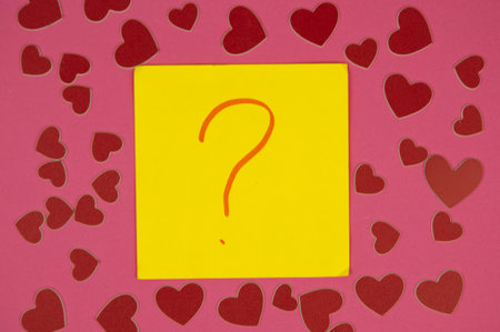Memo piece of paper with drawn question marks on colored background. Top view. Minimalism