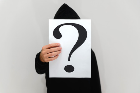 man in a hood covers his face with an inscription with a question mark