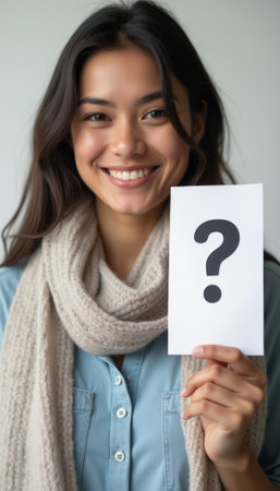 A cheerful young woman with long dark hair smiles brightly while holding a card featuring a large question mark. Her cozy scarf and soft blue shirt create a warm, inviting atmosphere, perfect for conveying curiosity and engagement.