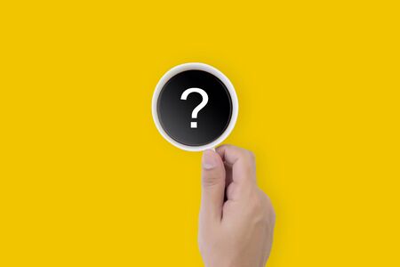 Hand holding cup of hot coffee with question mark isolated on yellow background, top view, q & a, faq or assistance for incentive, beverage or breakfast, communication and idea concept.