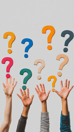 Raised hands reaching towards colorful question marks against a light background. Symbolizing curiosity and learning.