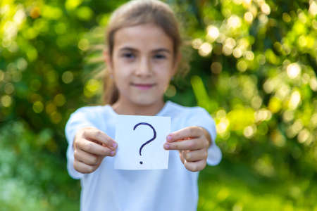 The child holds a paper with a question mark. Selective focus. Kid.