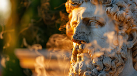 This captivating close-up showcases a marble statue's intricate details, illuminated by soft light and enveloped in ethereal smoke, evoking a sense of history.