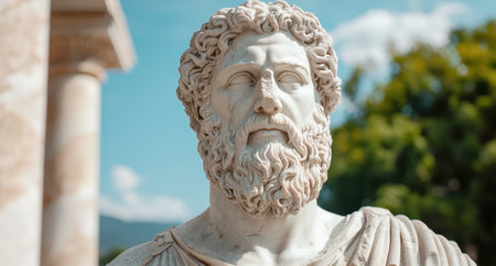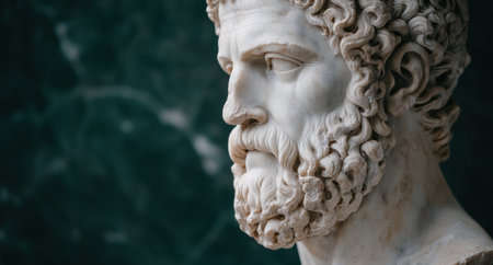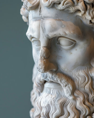 This close-up photograph showcases a striking ancient marble sculpture of a bearded man, highlighting intricate details and textures, ideal for art and history themes.