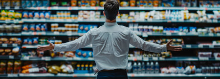 A man working in a bustling food market, surrounded by shelves and customers. The image highlights themes of food market, commerce, and customer service.