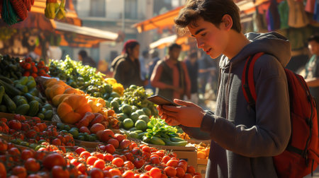 A young man with a backpack checks his phone in a lively market surrounded by vibrant fruits and vegetables in the sunlight.