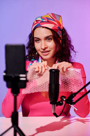 Attractive young woman in stylish outfit creating content for ASMR blog popping bubble wrap on mic and smartphone camera
