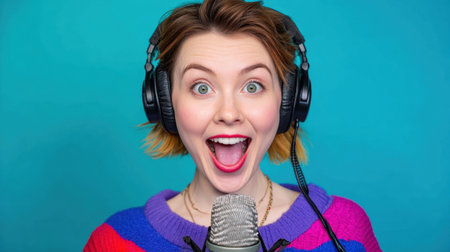 Cheerful young woman with headphones, excitedly singing into microphone against vibrant blue background, showcasing lively and energetic atmosphere