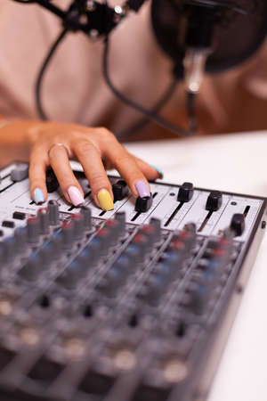 Close up of checking sound using mixer during podcast. Creative online show On-air production internet broadcast host streaming live content, recording digital social media communication