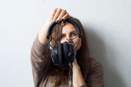 young caucasian woman with curly hair in sweater with close up headphones in her arms , music lover, music fan lifestyle female portrait