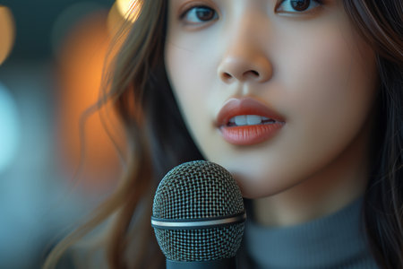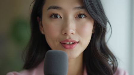 Elegant East Asian woman speaking into microphone with serene brown eyes and gentle smile